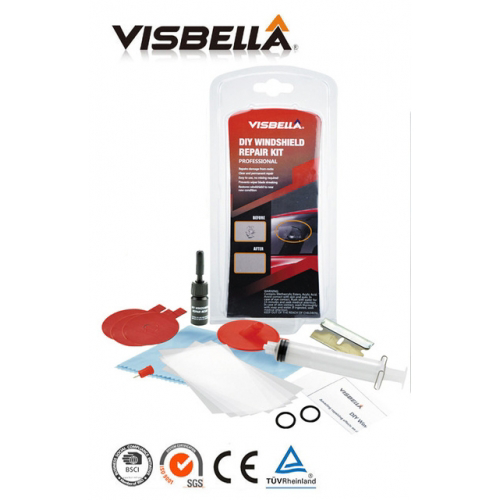 Visbella stiklo idauzos remonto komplektas. Tai vieno komponento stiklo remonto sistema, skirta remontuoti automobilio priekinio stiklo itrukimus tokius, kaip "buliaus akis" ar "zvaigzde" (galima naudoti keliems defektams). Nereikalauja kliju sumaišymo ar kaitinimo. Saugus ir lengvai naudojamas. Turi ta pati spindulio lauzimo koeficienta, kaip ir stiklas, todel remonto vieta faktiškai nepastebima. Norint gauti geriausius rezultatus, remontas turetu buti atliktas kuo greiciau po zalos atsiradimo, kol pazeista vieta neuzsiterše nešvarumais ar vandeniu. Neatlikinekite remonto ant saules - tai pagreitins kliju dziuvima ir jus nespesite pasiekti gero rezultato.